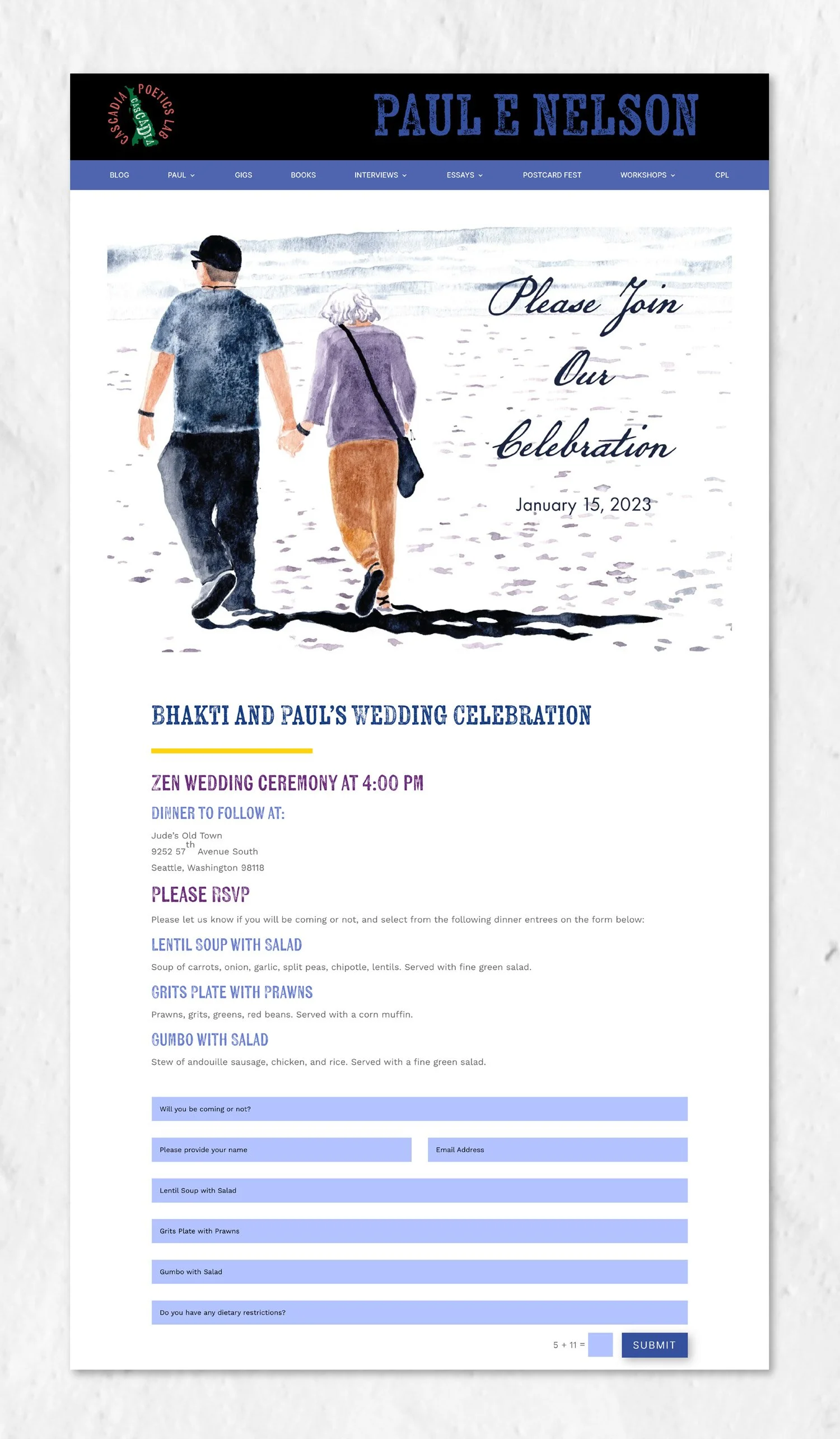 Wedding invitation and RSVP web page: original watercolor painting, typography and layout; printing on postcard size hand made paper; RSVP web page layout, design and development.