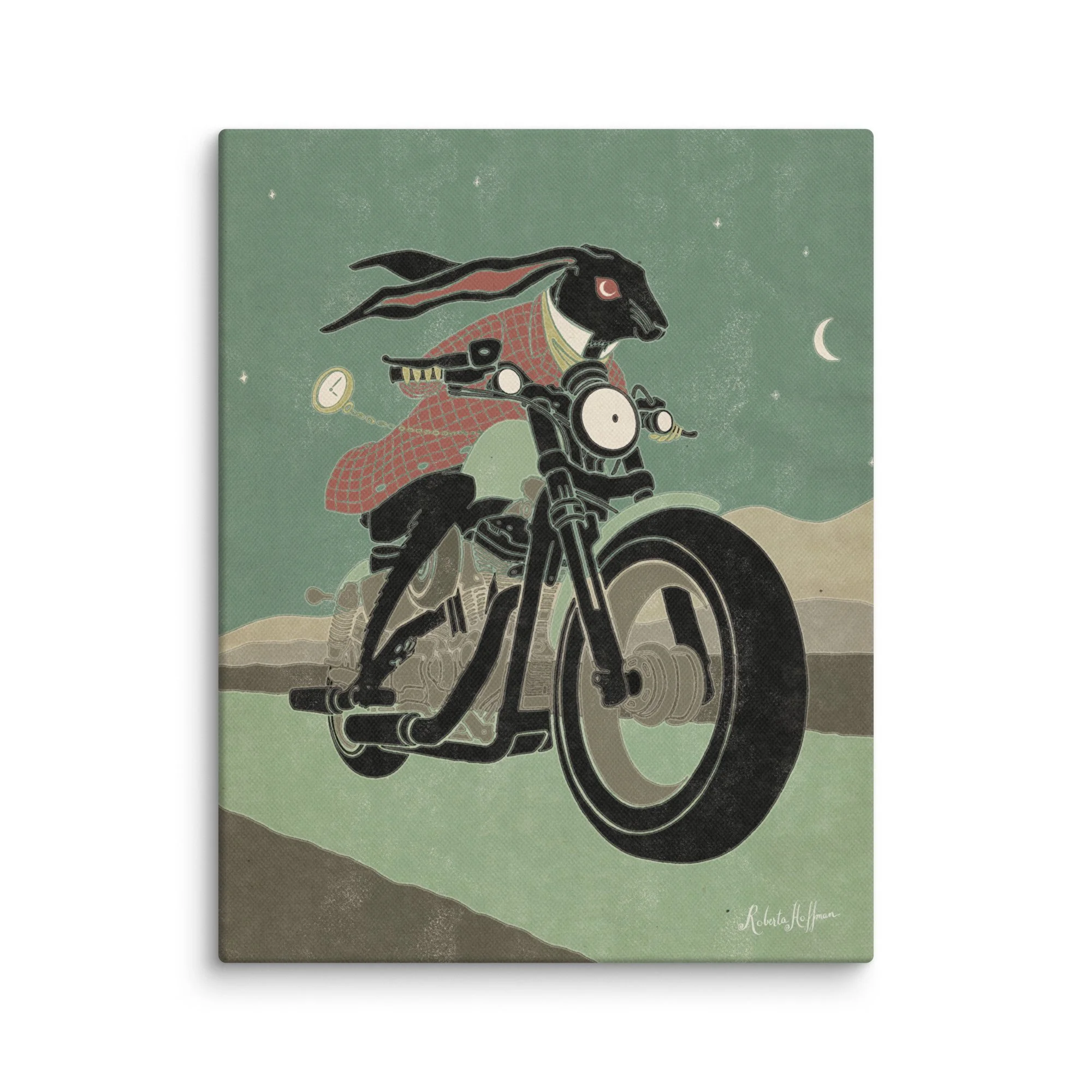 A whimsical twist on the classic Rabbit from Alice in Wonderland—this time, he's not just running late, he’s riding a Harley. “I’m late, I’m late, I better take the 48!” swaps panic for power as the Rabbit trades his frantic dash for a sleek Harley-Davidson 48, a stripped-down speed machine built for the ride. A bold fusion of storybook charm and motorcycle culture, this piece is part of Roberta’s moto-art series, originally shown and sold at motorcycle shows and moto-themed art events.