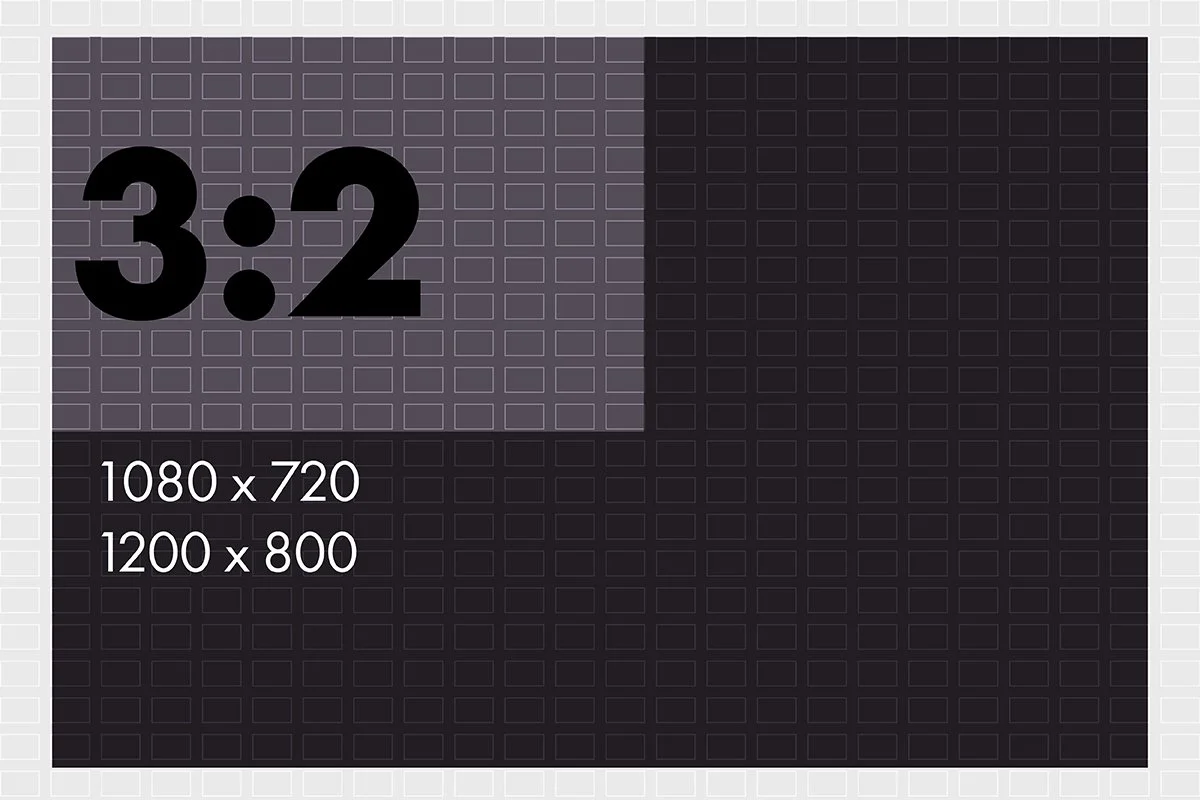 3:2 Standard = 1080 x 720, 1200 x 800, 1500 x 1000, 2500 x 1666.67